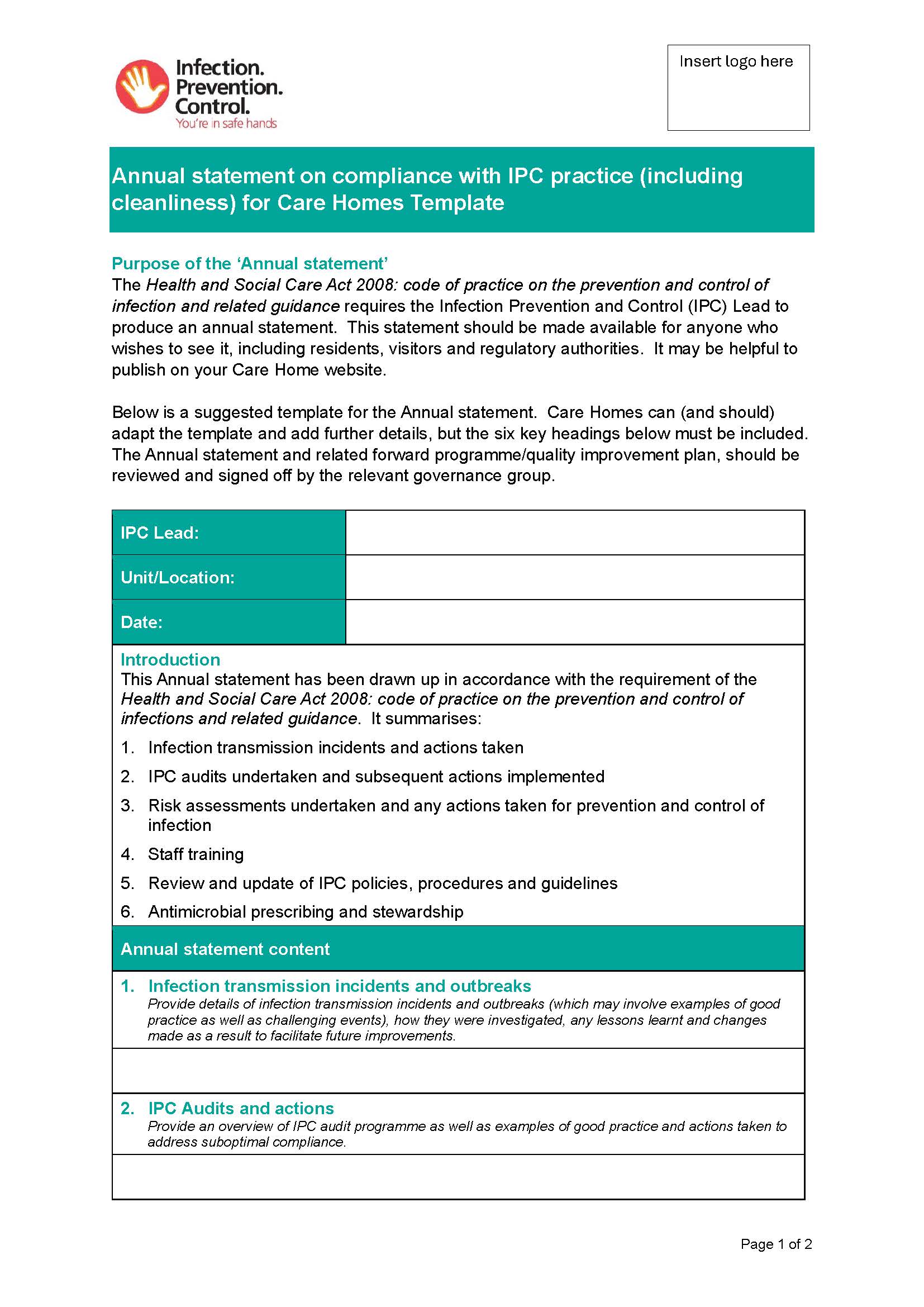 A suggested editable template for the Annual IPC statement. Care Homes can (and should) adapt the template and add further details, but the six key headings must be included.