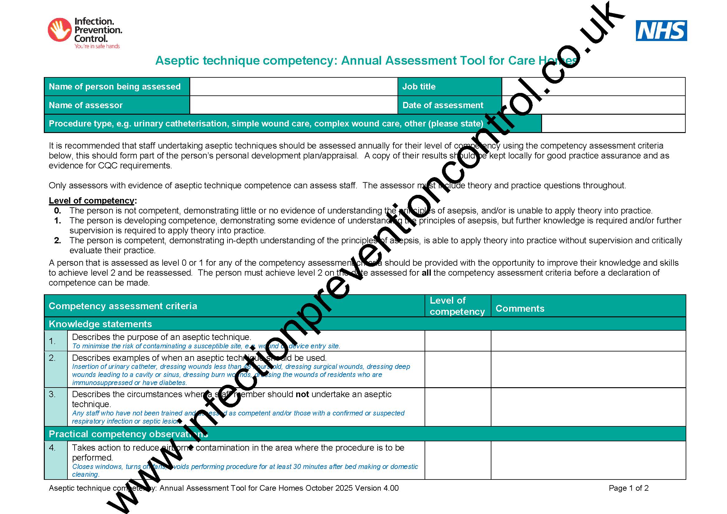 It is recommended that staff undertaking aseptic techniques should be assessed annually for their level of competency using the competency assessment criteria provided on the audit tool, this should form part of the person’s personal development plan/appraisal. A copy of their results should be kept locally for good practice assurance and as evidence for CQC requirements.