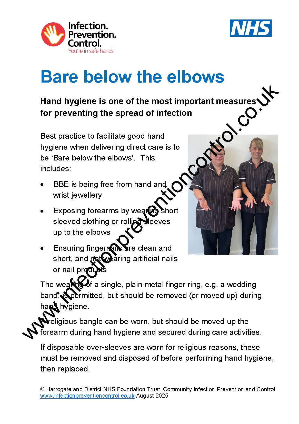 Best practice to facilitate good hand hygiene when delivery direct care to services users is to be ‘Bare below the elbows’.
