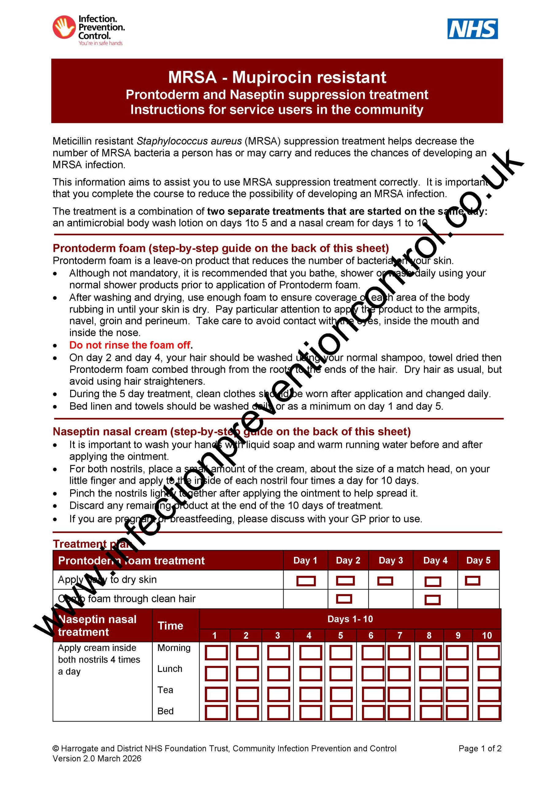 Step by step guide for service users in the community on PVL-SA Mupirocin resistant suppression treatment using Prontoderm foam and Naseptin nasal cream.